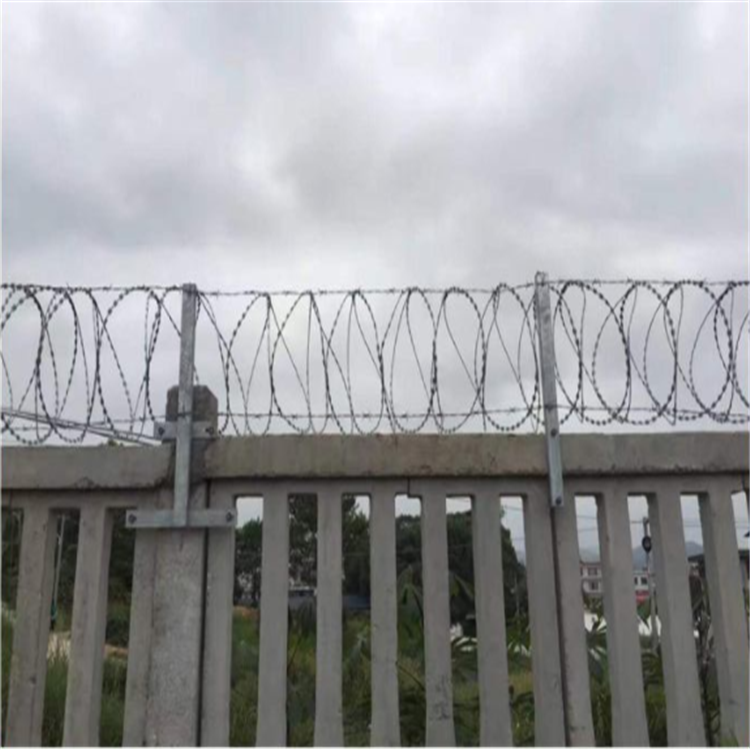 高鐵刺絲滾籠設(shè)置安裝規(guī)范:高鐵刺絲滾籠采用刀片刺繩繞圈后相臨兩圈每隔120°用刺絲連接卡固定,張開后形成蛇腹網(wǎng)狀,閉合后刀片刺繩圈徑為50cm,張開后每交叉圈安裝間距20cm,直徑不小于45cm。鐵路刺絲滾籠由刺絲連接卡扣與固定在支架上的縱向拉筋相連接,縱向拉筋與支架的連接采用o2.5mm的冷拔鍍鋅鋼絲繞2圈后檸緊固定,支架設(shè)置在跨度3m防護(hù)柳欄的立柱和跨中位置,其他跨度僅設(shè)置與立柱上部,支架與防護(hù)柵欄采用支架抱箍連接。鐵路刺絲滾籠刀片刺繩由沖切鋼板采用機(jī)械壓軋?jiān)阡摻z上成型,刀刺寬度22mm,兩刃垂直間距15mm,刀刺縱向間距34m芯絲直徑為2.5mm。刀片采用厚度0.5mm的Q195鋼板沖切制作,芯絲由HPB30006.5mm高線鋼絲加工。