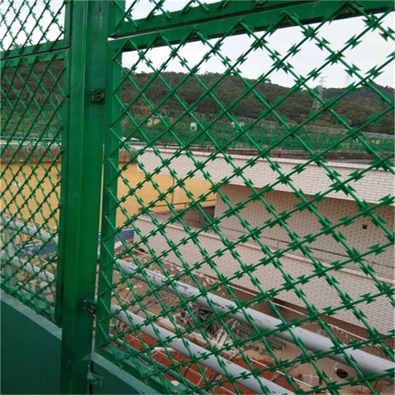 監獄刀刺隔離網頂部按照要求安裝蛇腹形刀刺網500mm,立柱頂部的V型直接兩個側臂焊接有專用的刺網勾,是每個側架設三道熱鍍鋅鋼絲,形成一個V型槽,然后把刀刺網放到上面,再用配套卡扣把鋼絲和刀刺網連接到一起,如果V型架內安裝V型網架,安裝就更簡單了,直接把刀刺網連接到V型網上面就可以了。