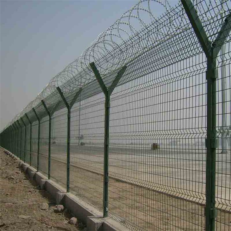 機場Y型護欄網隨著現在生活節奏的加快,生活水平的提高,人們在出差或者游玩時,會選擇乘坐飛機,那么飛行區就要保證沒有非工作人員和小動物誤入跑道,對飛機的起飛與降落造成危險。為此機場四周會安裝機場護欄網, 又稱作“Y型安全防御護網”,機場隔離網、機場圍界網是由V型支架立柱,加強型焊接網片,安全防盜連接件和熱鍍鋅刀片刺繩組成的安全防御性級別很高的護欄網。具有安全性高、防攀爬能力好,網片連接方式采用特制SBS緊扣件,有效防止人為的破壞性拆卸。如果在機場Y型護欄網頂部加裝刀片刺絲、刀片刺網后又很好的增強了安全防護性能。采用電鍍、熱鍍、噴塑、浸塑等防腐形式,具有很好的、抗曬、耐腐蝕等特 點。其產品造型美觀、花色多樣,既起到圍欄作用,又起到美化作用。