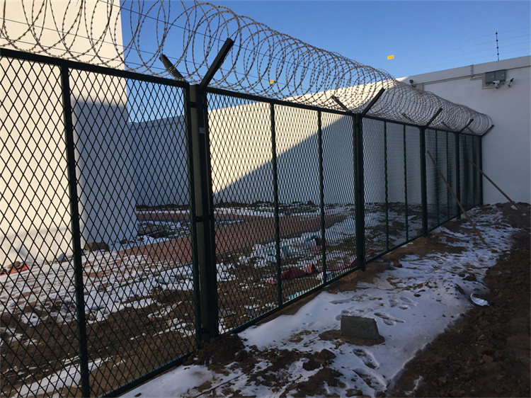 監(jiān)獄帶刺的Y型柱防護網(wǎng)也稱為監(jiān)獄護欄網(wǎng)或監(jiān)獄隔離柵欄,監(jiān)獄防護網(wǎng)的防護水平較高。通常,頂部需要蛇形刀刺網(wǎng)以加強保護,在監(jiān)獄防護網(wǎng)的柱子頂部制作一個V形,然后在V形中設置一個風箱狀的刀刺網(wǎng)。這樣,監(jiān)獄防護網(wǎng)的柱子形成Y形,可以用作安裝防護網(wǎng)和波紋管形刀刺網(wǎng)的柱子。