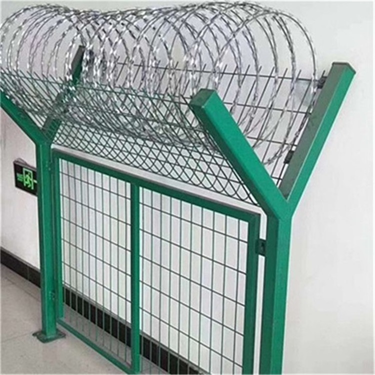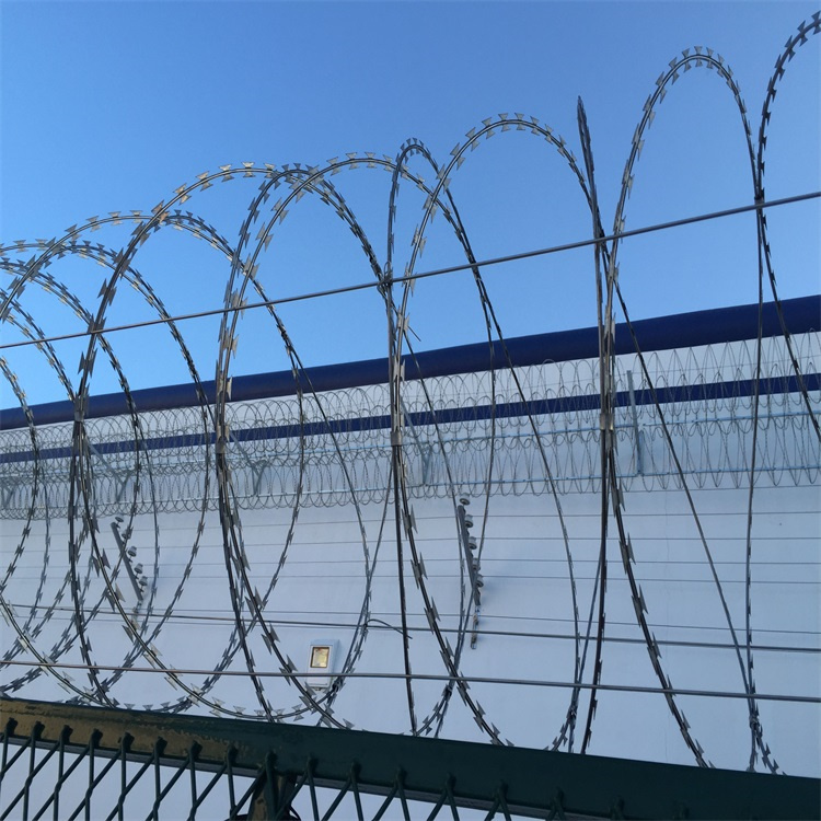 刀刺網(wǎng)通常由鋼板壓制成的刀片包事在鐵絲上制成,這種鍍層的鋼板或薄片作為刀片,使得整個(gè)護(hù)欄網(wǎng)看起來既美觀大方,又具有強(qiáng)烈的震懾和恐嚇作用,從心理上對(duì)潛在的入侵者起到阻撓作用。