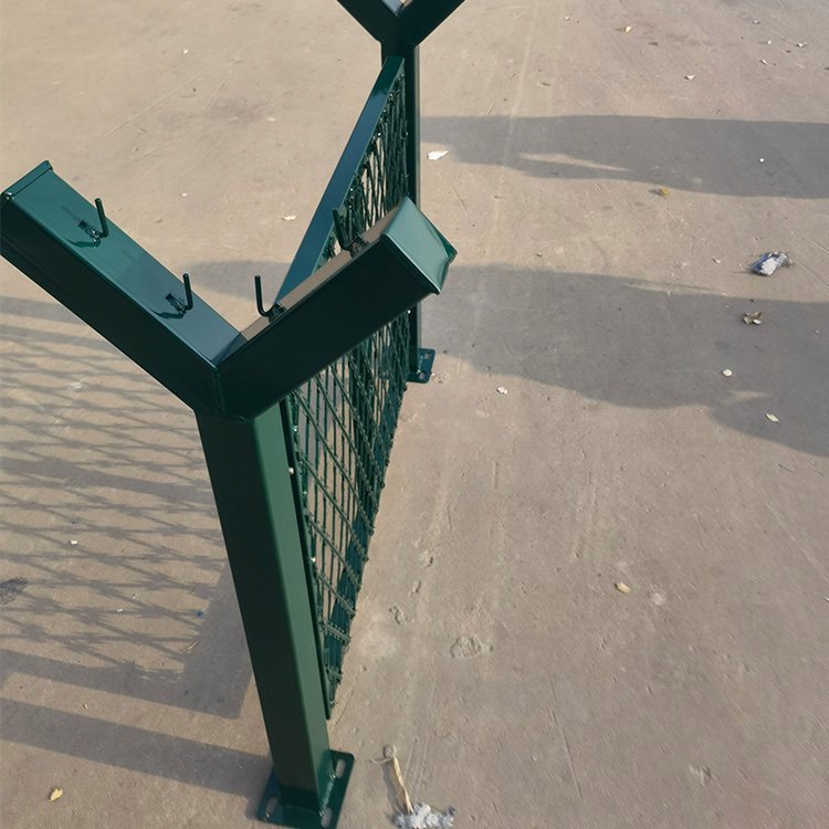 采用螺栓固定邊耳式連接,網片每邊與立柱連接點不少于六處。3、立杜采用水泥澆灌預埋式,規格為500*500*600mm長*寬*深),底座每邊距邊緣150mm外各預制兩文直徑24mm熱鍍鋅螺栓,螺栓高于底座平面50mm,螺栓間距為200mm與立柱法蘭盤螺孔相適應。立柱保持平直、不歪斜。