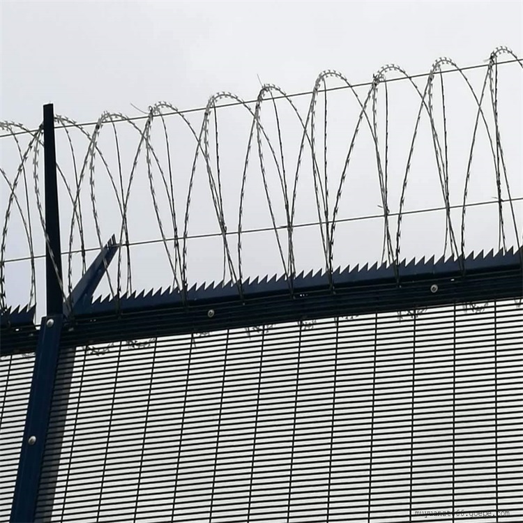 艾瑞監(jiān)獄防逃網(wǎng)焊接的鐵絲網(wǎng)片形成75*150mm的網(wǎng)片至于上下螺旋刀片刺網(wǎng)的中間部分,安裝刀刺網(wǎng)的立柱采用50*60mm方管,壁厚在2—2.5mm ,高2.4米,底部2米國(guó)直線,上部0.4米向內(nèi)折30度成斜線,立桂間隔為3米;長(zhǎng)3米為一個(gè)單位:立柱表面涂黑綠色(注塑工藝),立柱配有連接件焊接的鐵絲網(wǎng)片和蛇腹網(wǎng)結(jié)合使用,使人望而卻步,擊破人的僥幸心理.