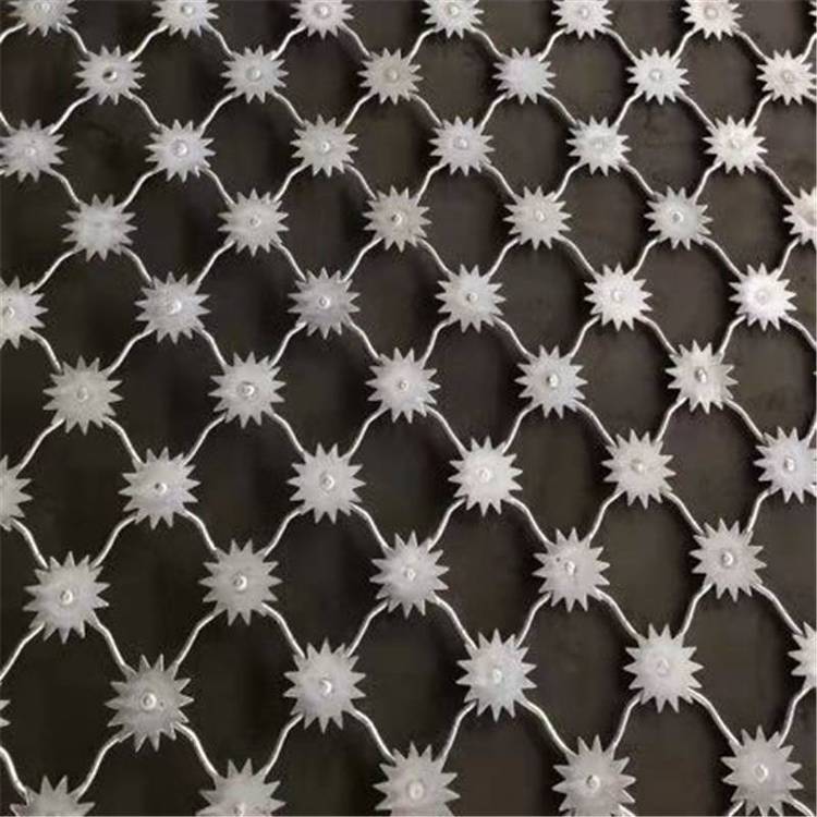 梅花刺鋼網墻規格尺寸:2.24*1.63米、1.53*163米、3.34 2.24米、3.34*1.02米、3.34*1.63米等不同規格、絲徑不低于600#。梅花刺鋼網墻立柱采用V型鍍鋅鋼管:壁厚150*150-8mm /網片邊框60+60~2.5m、Y型立柱安裝不銹鋼刀片刺網。梅花刺鋼網墻的顏色:梅花刺鋼網墻表面墨綠色噴涂、也常用銀灰色噴涂、高端大氣、既起到防腐防銹的作用、又有裝飾的效果。梅花刺鋼網墻網片、立柱要求整體熱鍍鋅,上鋅量不低于100克,可做霧化試驗(附檢測報告),護欄網整體鍍鋅在內陸自然環境下鋅層要求使用不低于10年。