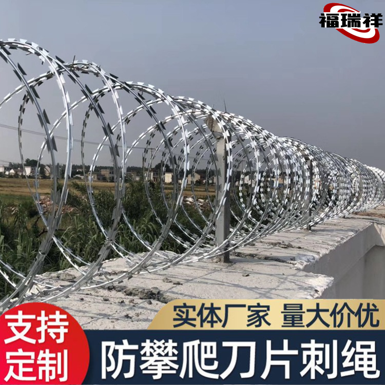 刀片刺繩是總體來(lái)說(shuō)只要你需要安全防御的地方就可以使用,因?yàn)椴幌迗?chǎng)地、不限地點(diǎn)。易安裝,易搬運(yùn)。用在監(jiān)獄護(hù)欄網(wǎng)頂端的刀片刺繩,它是一種近年發(fā)展起來(lái)的防護(hù)、隔離能力較強(qiáng)的新型防護(hù)網(wǎng)產(chǎn)品。它采用鋼板沖壓成型包附于鋼絲之上,由銳利尖角鍍鋅鋼板或不銹鋼薄板做刀片,高張力鋼絲做芯線組合而成的。根據(jù)形狀可分為:螺旋式-刀片刺網(wǎng)、交叉式-刀刺網(wǎng)、平板式-刀片刺網(wǎng)、直線式-刀片刺網(wǎng)。