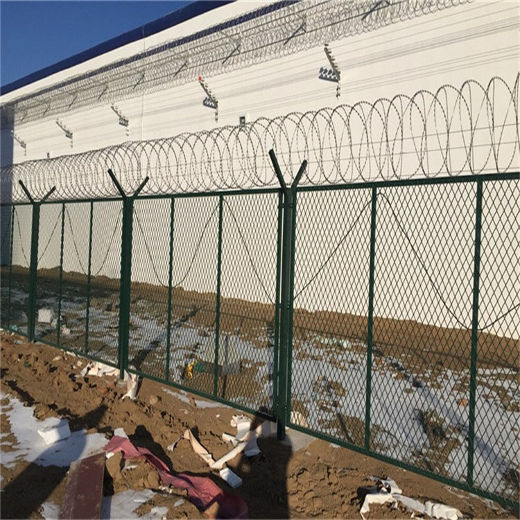 監獄鋼網墻款式-梅花刺鋼網墻作用總體的有,普通監獄鋼網墻,太陽花刺鋼網墻,菱形焊接刀片刺網,螺旋式刀片刺鋼網墻,鍍鋅358監獄防攀爬鋼網墻等等,但總得來說,要有大于5.0mm粗的絲徑,或者是刀刺網焊接,另外立柱不得少于2.0mm壁厚,直徑不低于60*60mm,頂部加裝V型架,在頂部V型架上裝有刀刺網;而對于太陽花刺鋼網墻來說,在網片的絲和絲的交叉處,焊接類似太陽花的刀片,起到防攀爬的作用。